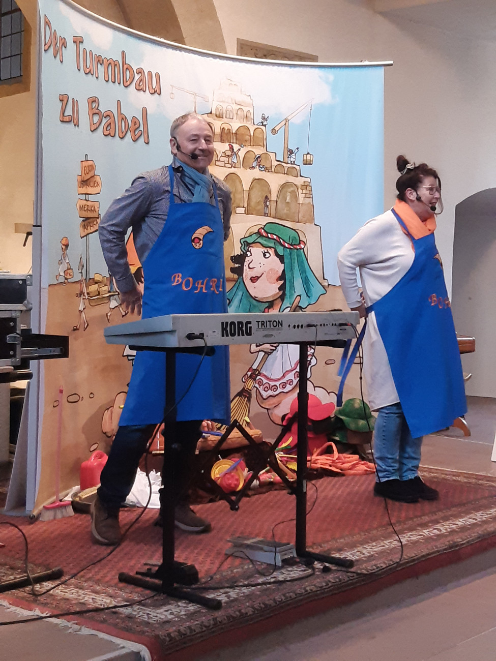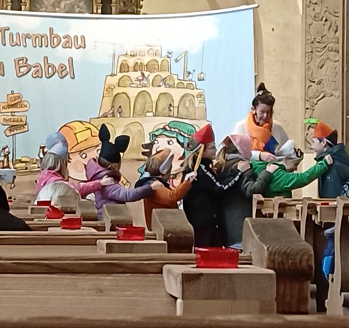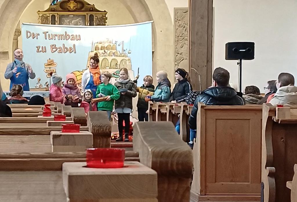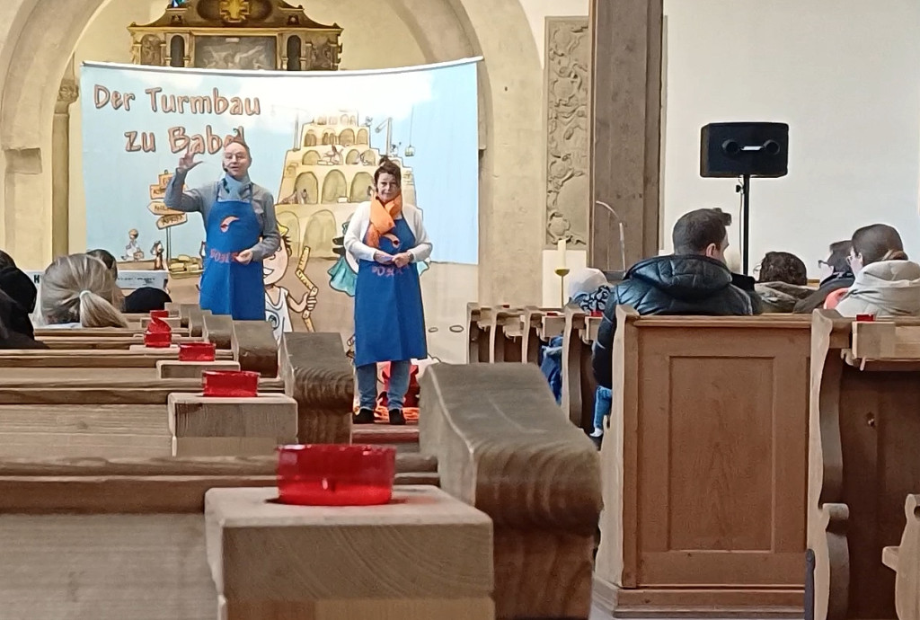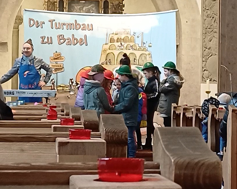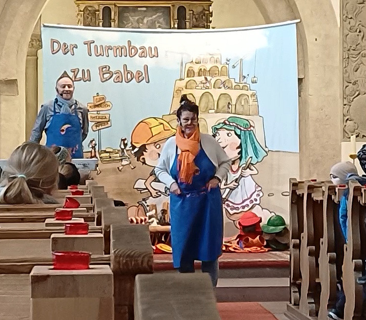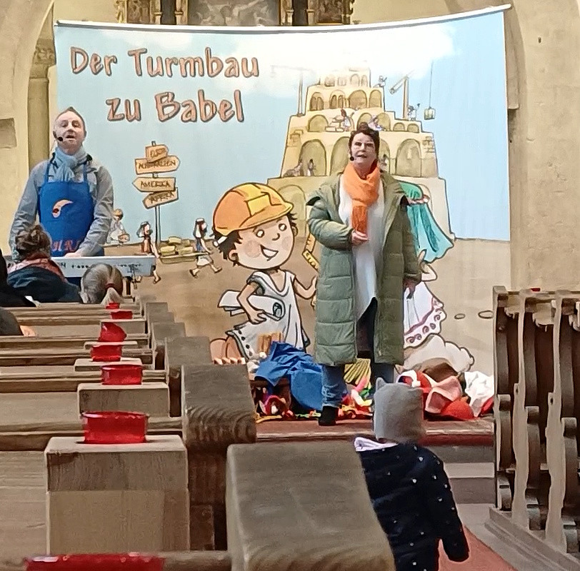 Wie bereits im vergangenen Jahr nahmen Gabi und Amadeus Eidner auch Chemnitz als Holzwürmer Bohra und Bohris die jungen und älteren Gottesdienstbesucher mit auf eine spannende Reise durch die Bibel. Die Reise führte zunächst nach Mesopotamien ins Zweistromland zwischen Euphrat und Tigris, wo Bohra und Bohris erfahren, dass in Babel die Menschen begannen, einen riesigen Turm zu bauen, um Gott gleich zu sein. Gott war sehr traurig darüber und beendete den menschlichen Größenwahn durch die Sprachverwirrung. So entstand auf der Baustelle ein gigantisches Chaos.